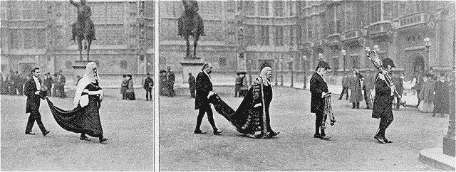 La singularité pittoresque de ce défilé mérite d'être remarquée. On y voit, en effet, en pleine civilisation moderne, se dérouler sur la place publique, comme jadis, un cortège d'hommes vêtus de longues robes plus ou moins fourrées, coiffés de vastes perruques blanches semblables à des passe-montagnes, en tête duquel marchent gravement, à pas comptés, les deux dignitaires suprêmes de l'ordre, le «lord-chief-justice» et le «lord-chancellor», précédés d'huissiers et de massiers, suivis de porte-queue. Tandis que, chez nous, aujourd'hui, les gens de robe ne se résignent plus guère à s'exhiber dehors à pied, sous leur harnais professionnel, qu'aux grands enterrements officiels où les astreint le décret de messidor, chez nos voisins d'outre-Manche, ils ne craignent pas d'affronter la rue dans un appareil dont l'archaïsme plus complet jure davantage encore avec l'état actuel des moeurs. A Paris, un tel anachronisme ne manquerait pas de provoquer les sourires narquois, voire les quolibets irrévérencieux des badauds; à Londres, le prestige de la magistrature n'en est nullement compromis aux yeux des spectateurs qui, sans la moindre manifestation malséante, gardent une attitude flegmatiquement respectueuse.