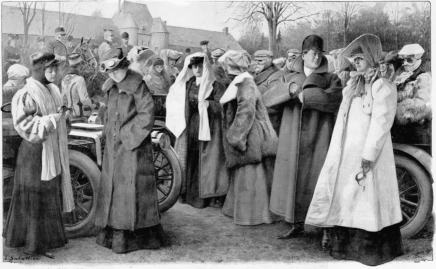 Il n'est pas besoin d'être un vieux chasseur pour se rappeler avec émotion le joli et pittoresque spectacle que présentait, dans le sous-bois d'automne, ou dans la cour du château accueillant, un rendez-vous de chasse, naguère. Tandis qu'à cheval caracolaient déjà et de souples amazones, le «lampion» sur l'oreille, et des officiers sanglés dans leur dolman bien ajusté, et les chasseurs les premiers en selle de l'équipage, des breaks, des victorias, des landaus, des tilburys, tous les véhicules disponibles, se chargeaient de la foule impatiente des invités; les hennissements des attelages répondaient à ceux des chevaux de selle, piaffant. L'avènement de l'automobile a changé, et profondément, tout cela. Et c'est le ronflement des teufs-teufs qui accompagne désormais le sémillant brouhaha du départ en forêt; ce sont de rapides quarante chevaux qui emmènent, en trépidant et soufflant, vers les futaies défeuillées, les belles spectatrices doublement emmitouflées, contre l'hiver, contre le vent, coiffées d'hétéroclites casquettes plus volontiers que de chapeaux élégants, voilées d'épaisses gazes ou masquées de lourdes lunettes, et pourtant gardant toujours leur charme d'élégance sous le faix des manteaux-sacs, derrière l'armature disgracieuse des besicles de route.