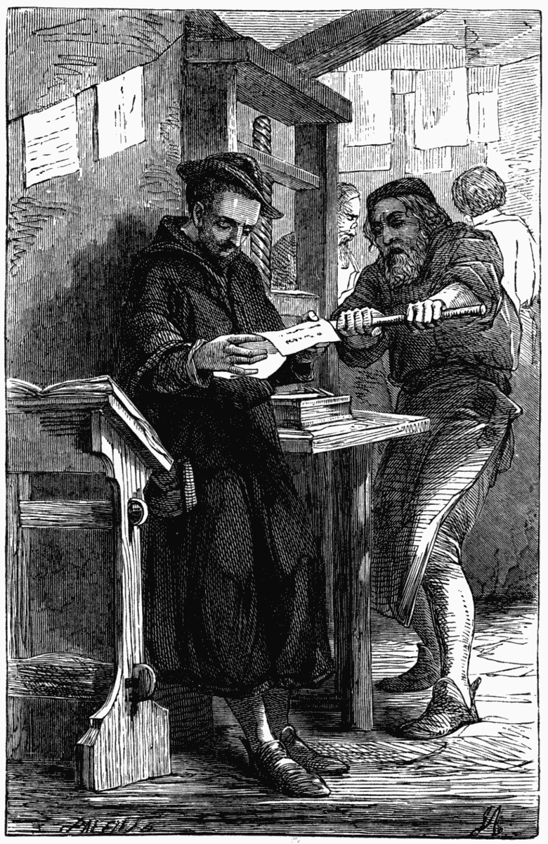 Gutenberg had scarcely completed his printing machine, and got it into working order, when the jealousy and distrust of his associates in the nominal business he carried on, brought him into trouble with the authorities of Strasburg. He could have saved himself by the disclosure of all the secrets of his invention; but this he refused to do. His goods were confiscated; and he returned penniless, with a heavy heart, to his native town Mentz. There, in partnership with a wealthy goldsmith named John Fust, and his son-in-law Schoeffer, he started a printing office; from which he sent out many works, mostly of a religious character. The enterprise throve; but misfortune was ever dogging Gutenberg's steps, and he had but a brief taste of prosperity. The priests looked with suspicion upon the new art, which enabled people to read for themselves what before they had to take on trust from them. The transcribers of books,—a large and influential [Pg 25] guild,—were also hostile to the invention, which threatened to deprive them of their livelihood. These two bodies formed a league against the printers; and upon the head of poor Gutenberg were emptied all the vials of their wrath. Fust and Schoeffer, with crafty adroitness, managed to conciliate their opponents, and to offer up their partner as a sacrifice for themselves. By the zeal of his enemies, and the treachery of his friends, Gutenberg was driven out of Mentz. After wandering about for some time in poverty and neglect, Adolphus, the Elector of Nassau, became his patron; and at his court Gutenberg set up a press, and printed a number of works with his own hands. Though poor, his last years were spent in peace; and when he died, he had only a few copies of the productions of his press to leave to his sister.