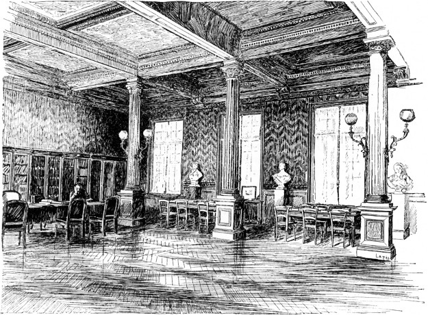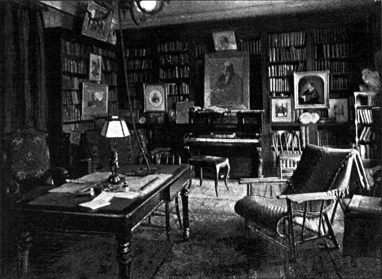 Across the narrow back hall one takes a quick glimpse of the four phases of the moon on the stairway, then of hundreds of volumes lining 293 the walls, billows of books, breaking upon one everywhere—five thousand of them.