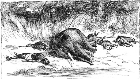 “At this time a woman approached, and seeing four lions and one elephant and her husband dead, she raised up her hands wonderingly, and cried, ‘How did all this happen?’ The elephant, hearing her voice, came from behind a tree, with a spear quivering in his side, and bleeding profusely. At the sight of him the woman turned round to fly, but the elephant cried out to her, ‘Nay, run not, woman, for I can do you no harm. The happy days in the woods are ended for all the tribes. The memory of this scene will never be forgotten. Animals will be at constant war one with another. Lions will no more greet elephants, the buffaloes will be shy, the rhinoceroses will live apart, and man, when he comes within the shadows, will think of nothing else than his terrors, and he will fancy an enemy in every shadow. I am sorely wounded, for thy man stole up to my side and drove his spear into me, and soon I shall die.’