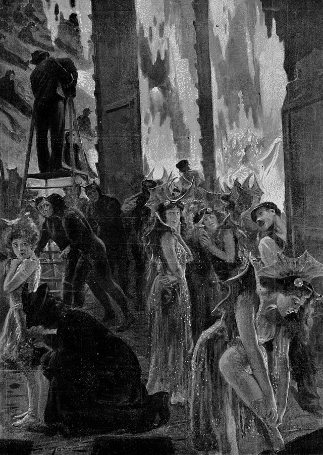 Un peintre espagnol, M. Marinno Fortuny, propose, pour l'éclairage des scènes de théâtre, un système original. Actuellement, la scène reçoit de la lumière directe projetée, en général, par des lampes à incandescence; quelquefois par des lampes à arc installées dans les coulisses ou dans la salle. Il en résulte des ombres portées d'un effet au moins désagréable à l'oeil, quand elles n'enlèvent as l'illusion de la perspective. A cette lumière directe, M. Fortuny substitue la lumière diffuse. Le plafond de la scène est formé par une voûte en toile blanche, sur laquelle on projette la lumière de l'arc voltaïque réfléchie d'abord par une bande où est imitée la couleur du ciel. Cette bande étant mobile, il suffit d'y peindre des gammes différentes et de la faire glisser sous le faisceau lumineux pour produire une succession de nuances aussi variées et aussi graduées qu'on le désire. En utilisant à la fois deux ou trois bandes placées en des points plus ou moins distants, on réaliserait sur la voûte céleste des effets de coloration inconnus jusqu'à ce jour. Enfin, on pourrait opposer aux rayons de certaines lampes des miroirs où l'on aurait peint des nuages qui se trouveraient eux-mêmes projetés sur le ciel et dont la marche serait obtenue par un simple déplacement du miroir.