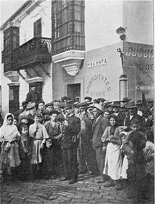 ![]() Cour intérieure de l'hôtel Reina Maria-Cristina. Au coin de la rue Sagasta, un agent de police a provoqué un rassemblement où se mêlent des gamins, des femmes, quelques oisifs, des passants peu pressés. Le gardien de l'ordre remplit, pour l'heure, l'office de crieur public et, d'une voix bien placide, récitant une leçon apprise, fait connaître au populaire je ne sais quelle oiseuse nouvelle, annonce quelque objet perdu ou promulgue un acte de l'autorité; puis, sans hâte, s'en va vers le carrefour voisin recommencer sa brève histoire. |