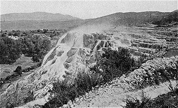 Il y a plusieurs siècles, l'eau jaillissait par des trous isolés, autour desquels les dépôts calcaires formèrent des cônes jusqu'à la hauteur que la pression de l'eau ne pouvait plus vaincre. Ces cônes se sont alors bouchés; ils subsistent près de l'établissement thermal, au nombre d'une centaine, d'une hauteur de 1 à 15 mètres. On en voit un dans le fond d'une de nos gravures.