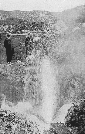 Le 13 novembre dernier, à 11 heures du matin, les touristes déjeunant à Hammam-Meskoutine entendirent soudain une forte détonation et aperçurent un jet de vapeur considérable sortant du sol, à une dizaine de mètres d'un ancien cône. On distingua bientôt une colonne d'eau qui, depuis lors, jaillit sans intermittence, avec accompagnement d'un bruit sourd, à une hauteur variant, suivant l'heure, de 3 à 6 mètres. Ce geyser sort du roc; mais, tout autour, à une dizaine de centimètres sous terre, on trouve du soufre en cristaux et en poudre. Le débit est de 450 litres par minute. L'eau, très sulfureuse, d'une limpidité de cristal, a une température de 97 degrés, supérieure d'un degré à celle des sources les plus chaudes du groupe. |