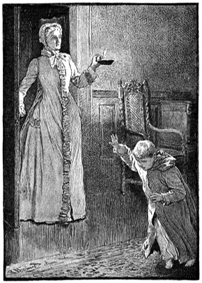 'Poor Prin,' he said, 'Denis can't get the door open. Den will have to go and get nurse to help. He'll be as quick as he can. Stay there, dear Prin,' and then he turned to climb the stair again, his feet this time perfectly numb with cold. He must get up two flights—past the day-nursery, to where nurse and baby slept, in what was called 'the old nursery,' a story higher than the other. But so long as there was no gallery to face, Denis did not seem to mind. He got on all right till he was crossing the landing or passage on to which the swing-door opened; then just as he was putting his foot on the first step of the second flight he was startled by a noise—a sound of footsteps approaching him, and, oh terror! from the direction of the gallery. In his fear he stood still, as if not knowing what to do. The steps came nearer and nearer with a rather slow, dragging sound. Denis still stood as if turned to stone. The baize door swung open, a light warmer and brighter than the moon rays gleamed through, and a figure stood full in the boy's sight. A tall figure, it seemed to him, clothed in yellow, with pale face and powdered hair, all [122] distinctly seen by the flame of the taper held in its hand.