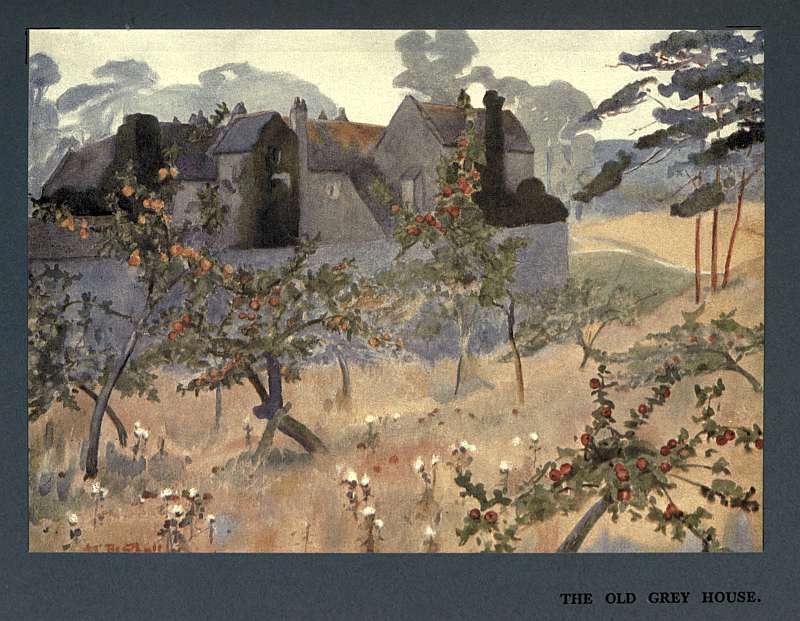At last the woodlands make an end, old orchards spread in a clearing, and the sun, now turning west, has left the apple trees, so that their blossom hangs cool and shaded on the boughs. Behind—a background for the orchard—there rise the walls of an ancient house, weathered and worn—a mass of picturesque gables and tar-pitched roofs with red-brick[58] chimneys ascending above them. No great dignity or style marks this dwelling. It is a thing of patches and additions. Here the sun still burns radiantly, makes the roof golden, and flashes on the snow-white "fan-tails" that strut up and down upon it.