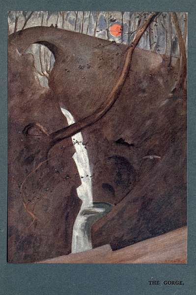 On a cloudy day night never departs from the deepest caverns of this gorge, and only the foam-light reveals each polished rib and buttress. The air is full of mist from a waterfall that thunders through the darkness, and chance of season and weather seldom permit the westering sun to thrust a red-gold shaft into the gloom. But that rare moment is worth pilgrimage, for then the place awakens and a thousand magic passages of brightness pierce the gorge to reveal its secrets. In such moments shall be seen the glittering concavities, the fair pillars and arches carved by the water, and the hidden forms of delicate life that thrive upon them, dwelling in darkness and drinking of the foam. Most notable is a crimson fungus that clings to the dripping precipices like a robe, so that they seem made of polished bloodstone, and hint the horror of some tragedy in these loud shouting caves.[74] Below the mass of the river, very dark under its creaming veil of foam, shouts and hastens; above, there slope upwards the cliff-masses to a mere ribbon of golden-green, high aloft where the trees admit rare flashes from the azure above them. Beech and ash spring horizontally from the precipices, and great must be the bedded strength of the roots that hold their trunks hanging there. With the dark forces of the gorge dragging them downward and the sunshine drawing them triumphantly up—between gravitation and light—they poise, destruction beneath and life beckoning from above. They nourish thus above their ultimate graves, since they, too, must fall at last and join those dead tree skeletons whose bones are glimmering amid the rocks below.