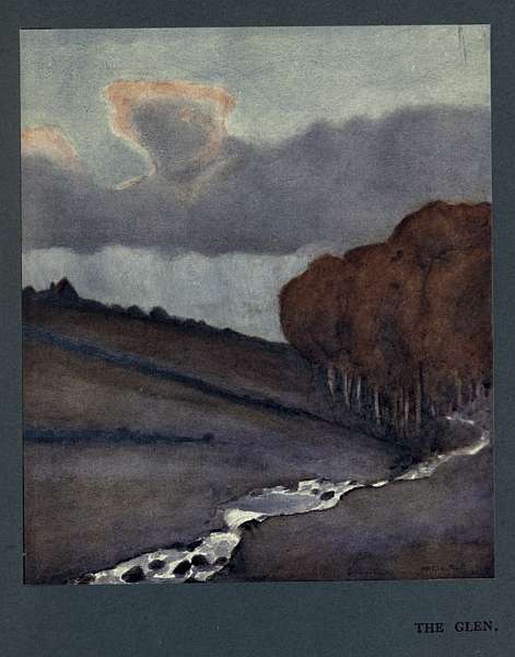 And now a sudden flash of red aloft above the tree-tops told that the sun was setting. Night thickened quickly, though the lamp of a great red snow-cloud still hung above the glen long after I had left it. Beneath, the mass of the beech wood took on wonderful colour and the streamlet, emerging into meadows, flashed back the last glow of the sky.
