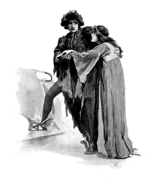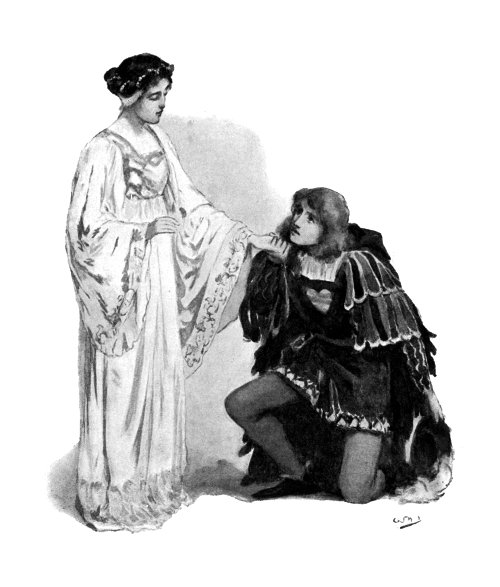 "Thou hast good cause to reproach me, dear one, erring only when thou dost affirm that she whom I love is not worthy to be my Queen. Were I but fit to tie her sandal or kiss the hem of her robe, I were glad indeed."[Pg 23]