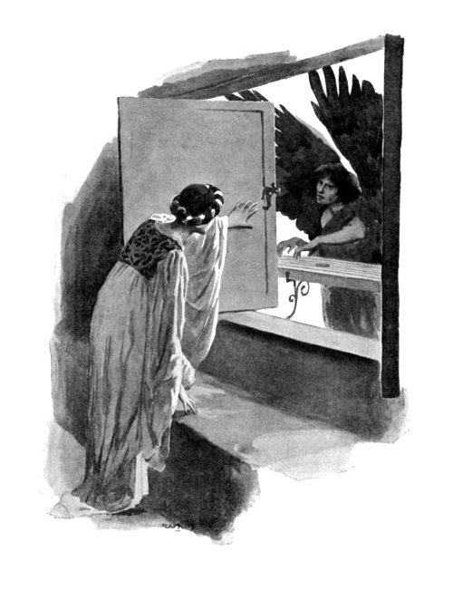 The hangings were of white silk, and the floor was of ivory. Silver vases, filled with purple lilacs, perfumed the air. Presently three maidens entered, to attire their mistress for the evening banquet. One bathed her face and hands with spring-water, another combed her hair with a silver comb, and the third robed her in a gown of soft silk, edged with pearls.