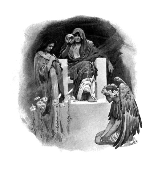 Beryl waited outside the village on the longest day of the year. In white robes and silken cap she watched for the passing of Time. Before the day began to wane a chariot, drawn by the Winds, dashed along the road which led to the Village of Youth. The maiden, though half dead with terror, flung herself down before the gates with a loud cry. She felt herself raised from the ground, and on opening her eyes found that she was in the arms of a ragged youth. His face was beautiful beyond all description, though its expression was full of sorrow; his garments were smirched with mud and hung in tatters, but they were jewelled from shoulder to hem with diamonds, whiter and more brilliant than any she had ever seen. Awed and[Pg 12] wondering, Beryl laid her finger softly upon one of the gems. But it dissolved and vanished at her touch; and she realised that Time's garments were jewelled with the world's tears.