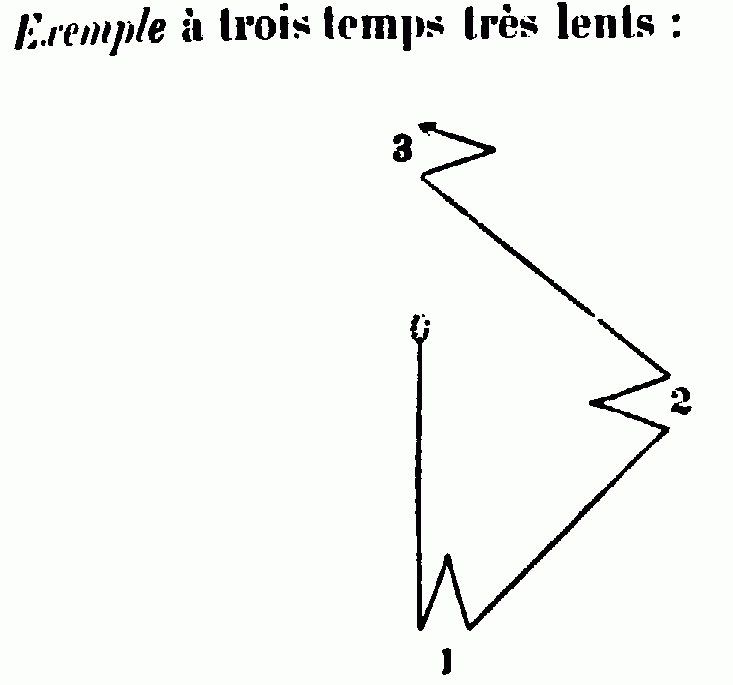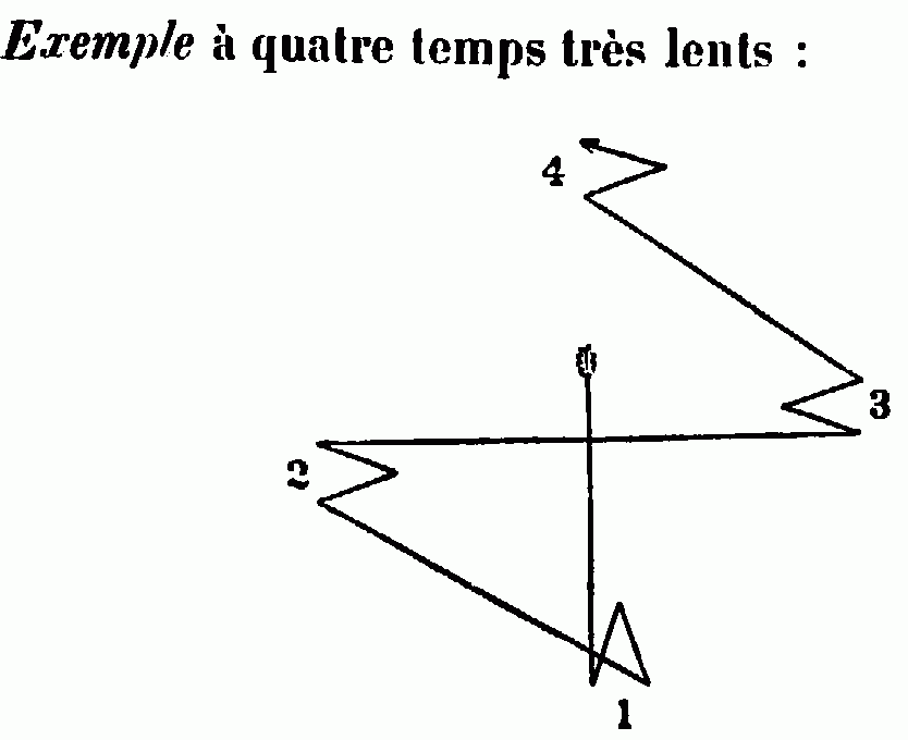 En tout cas, le troisième temps de la mesure à trois est toujours marqué comme le dernier de la mesure à quatre, par un mouvement oblique de bas en haut.