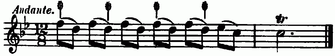 Dans cet exemple, la subdivision de la mesure par six, ou la division des temps par deux, est utile et ne présente aucun inconvénient pendant la mesure Nº 1: on fait alors le geste, mais il faut s'en abstenir dès le début de la mesure Nº 2 et se borner aux gestes simples à cause du triolet placé sur le troisième temps, et à cause du suivant que les gestes doubles contrarieraient beaucoup.