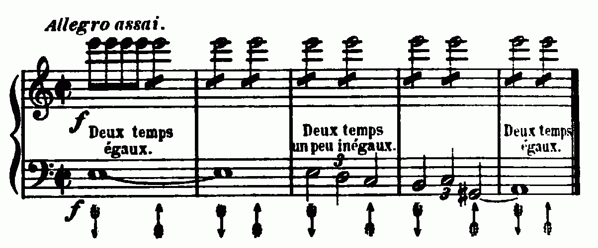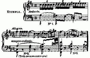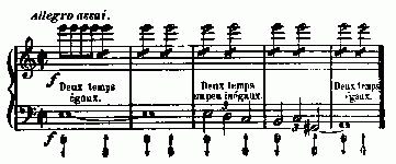 Ceci, on le voit, est assez simple au fond, parce que la division de la petite mesure et les subdivisions de la grande concordent entre elles. L'exemple suivant où une mesure lente est superposée à deux mesures brèves, sans que cette concordance existe, est plus scabreux.
