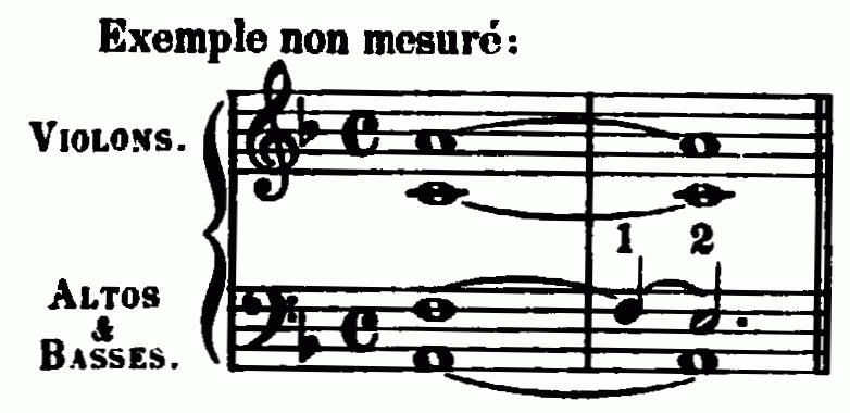 Dans cet exemple, le chef, tout en suivant la partie récitante non mesurée, a surtout à se préoccuper de la partie d'alto, et à la faire se mouvoir à propos du premier temps sur le second, du Fa sur le Mi au commencement de la deuxième mesure; sans quoi, comme cette partie est exécutée par plusieurs instrumentistes jouant à l'unisson, les uns tiendront le Fa plus longtemps que les autres et une discordance passagère se produira.