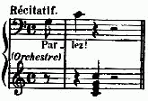 Dans un passage tel que celui-ci, ils lèvent le bras sur le soupir qui commence la mesure et l'abaissent sur le temps de l'accord. Je ne saurais approuver un tel usage que rien ne justifie et qui peut souvent amener des accidents dans l'exécution. Je ne vois pas d'ailleurs pourquoi on cesserait, dans les récitatifs, de diviser la mesure régulièrement et de marquer les temps réels à leur place, comme dans la musique mesurée. Je conseille donc, pour l'exemple précédent, de frapper le premier temps en bas comme à l'ordinaire, et de porter le bâton à gauche pour faire attaquer l'accord sur le second temps; et ainsi de suite pour les cas analogues en divisant toujours la mesure régulièrement. Il est très important en outre de la diviser d'après le mouvement précédemment indiqué par l'auteur, et de ne pas oublier, si ce mouvement est allegro ou maestoso, et si la partie récitante a longtemps récité sans accompagnement, de donner à tous les temps, quand l'orchestre rentre, la valeur de ceux d'un allegro ou d'un maestoso. Car quand l'orchestre joue seul il est en général mesuré; il ne joue sans mesure que s'il accompagne la voix récitante ou l'instrument récitant. Dans le cas exceptionnel où le récitatif est écrit pour l'orchestre lui-même, ou pour le chœur, ou bien pour une partie de l'orchestre ou du chœur, comme il s'agit de faire marcher ensemble, soit à l'unisson, soit en harmonie, mais sans mesure exacte, un certain nombre d'exécutants, c'est alors le chef d'orchestre qui est le vrai récitant et qui donne à chaque temps de la mesure la durée qu'il juge convenable. Suivant la forme de la phrase, tantôt il divise et subdivise les temps, tantôt il marque les accents, tantôt les doubles croches s'il y en a, enfin il dessine avec son bâton la forme mélodique du récitatif. Bien entendu que les exécutants, sachant leurs notes à peu près par cœur, ont l'œil constamment fixé sur lui, sans quoi on ne peut obtenir ni assurance ni ensemble.