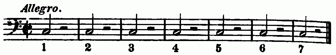 Les instruments à percussion placés, ainsi que je l'ai indiqué, sur l'un des derniers gradins de l'amphithéâtre, ont une tendance à ralentir le rhythme, à retarder. Une série de coups de grosse caisse frappés à intervalles réguliers dans un mouvement vif, comme la suivante: