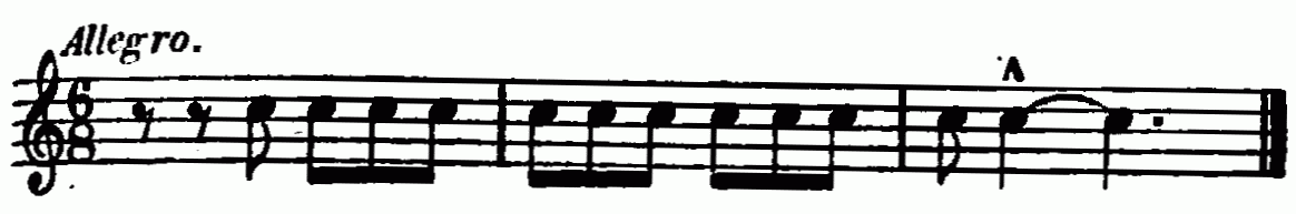 Le joueur de trompette, au lieu de respirer avant la première de ces trois mesures, respire au commencement, pendant le demi-soupir A et, ne tenant pas compte du petit temps qu'il a pris pour respirer, donne néanmoins toute sa valeur au demi-soupir qui se trouve ainsi surajouté à la valeur de la première mesure. Il en résulte l'effet suivant: