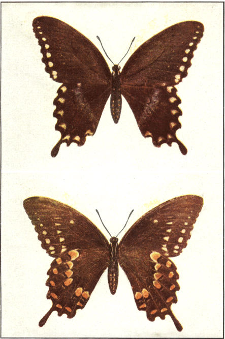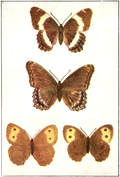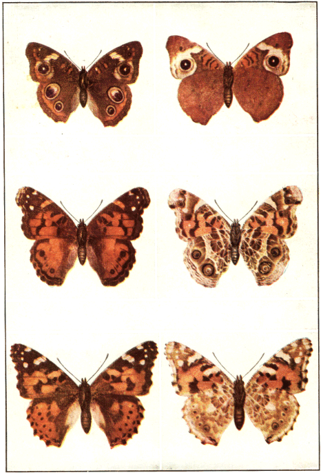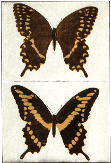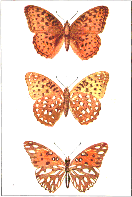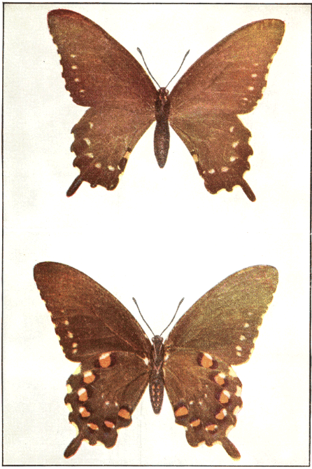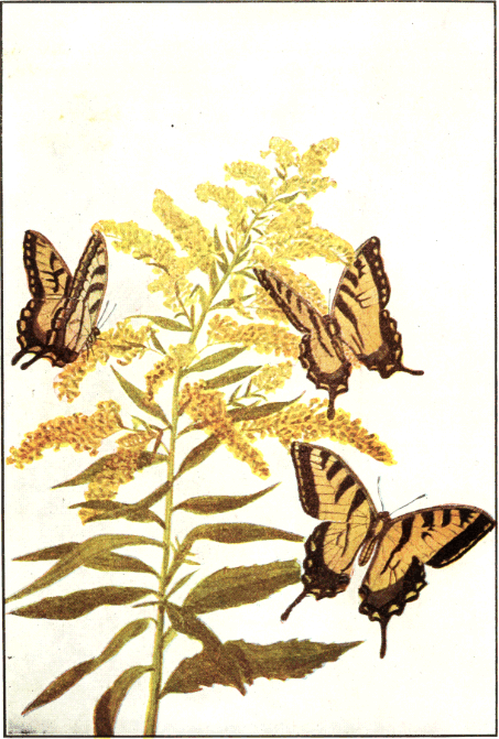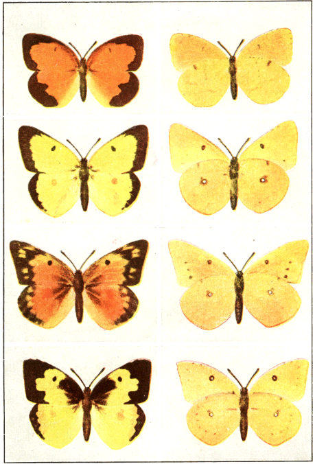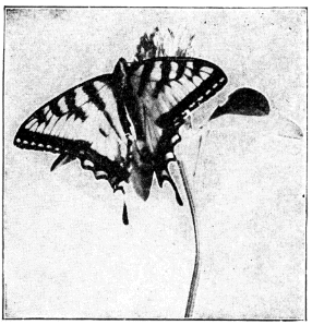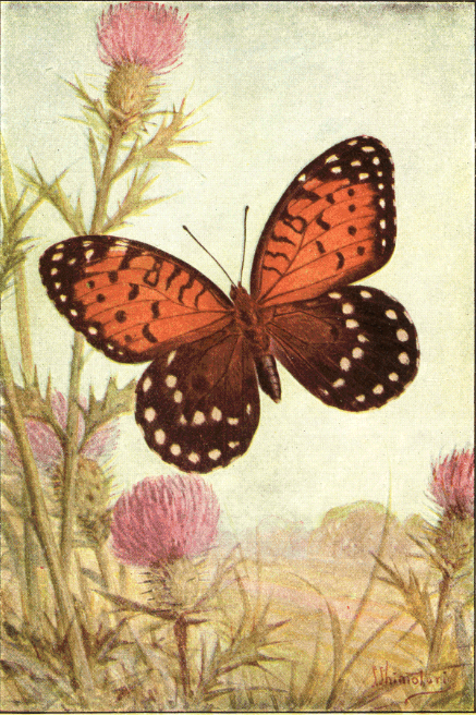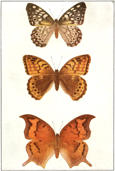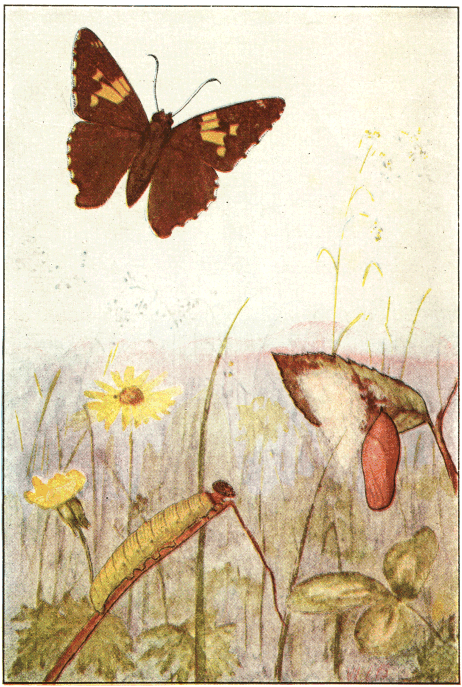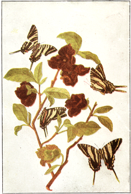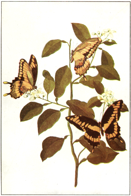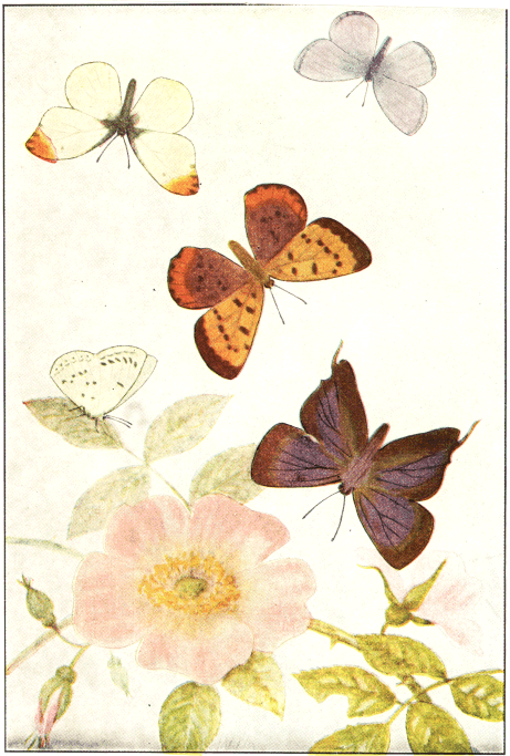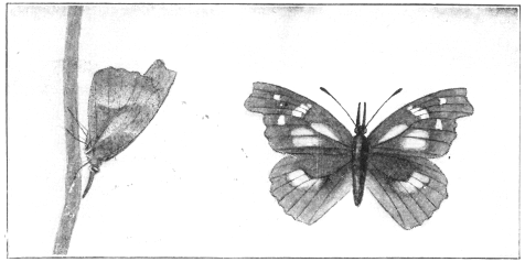 In popular esteem the butterflies among the insects are what the birds are among the higher animals—the most attractive and beautiful members of the great group to which they belong. They are primarily day fliers and are remarkable for the delicacy and beauty of their membranous wings, covered with myriads of tiny scales that overlap one another like the shingles on a house and show an infinite variety of hue through the coloring of the scales and their arrangement upon the translucent membrane running between the wing veins. It is this characteristic structure of the wings that gives to the great order of butterflies and moths its name Lepidoptera, meaning scale-winged.
