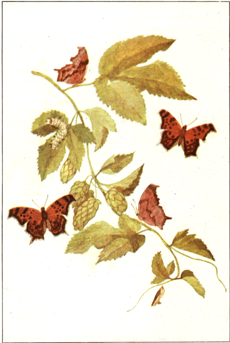 Angle-wings: Violet-tip; Hop-merchant or Comma; Gray Comma; Green Comma; Red Admiral