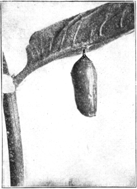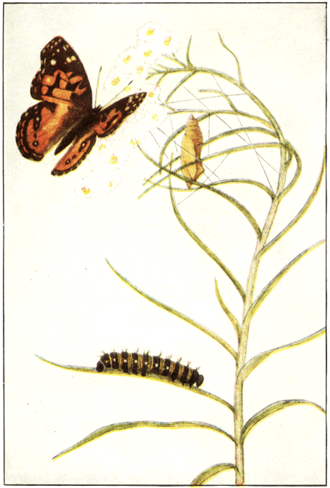 This butterfly is of particular interest because it is one of the comparatively few species that habitually occur in gardens and cultivated fields. The reason for this is that the eggs are laid upon white pigweed or lambs' quarter, [Pg 278] the common garden pest of the genus Chenopodium. The eggs are laid singly, generally on the upper surface, and hatch in about five days into tiny caterpillars that make a little shelter for themselves by cutting out the edge of a leaf and folding over the blade, sewing it in place by a few silken threads. Here they remain and feed upon the green pulp of the succulent leaves either within the nest or near by outside. They remain in these cases until the time for the first moult, when they are likely to line the inside of the silken web before moulting. After this they make new cases for concealment and shelter, the cases as they grow older being generally made of two or more leaves securely bound together by silken web along their margin. When they become full grown, they spin a silken cocoon and change to yellowish green chrysalids from which the butterflies emerge a little more than a week later.