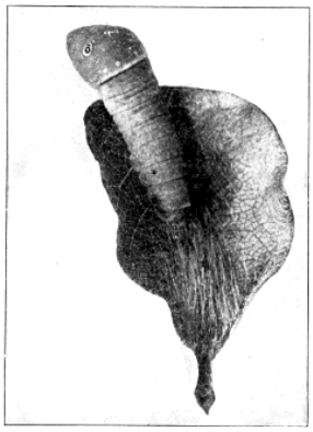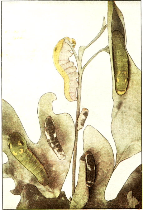 When autumn comes our caterpillar is faced with the problem of passing through the winter successfully. It must shelter itself from birds, spiders, predaceous beetles, and many other enemies. It must find a means of keeping out of the reach of snow and rain, for while it can survive a great degree of cold as long as it keeps dry, it might easily [Pg 275] be killed by freezing up with moisture. But the caterpillar is able to provide against these dangers. It has apparently an abundant supply of liquid silk to secrete from the silk glands in its head, so it lines its tubular tent with a dense silken web that effectually excludes enemies and moisture. It thus has on the outside of its nest the thick oak leaf and on the inside a dense soft lining that makes a most admirable winter protection. So it remains here throughout the winter, the leaf commonly staying on the tree until early spring. Then leaf, nest, and enclosed caterpillar are likely to drop to the ground to remain until spring arrives in earnest. Just what happens then seems to be a bit doubtful. The caterpillar changes to a chrysalis, but whether it first works its way out of its winter nest and makes a new and less dense covering seems not to be certainly known. Here is another good opportunity for some careful observations.