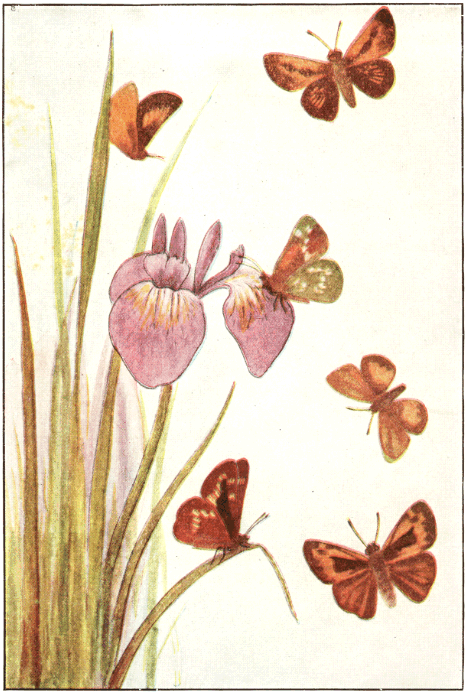 The Skippers are the least developed of the butterflies. They show their close relationship to the moths both by their structure and their habits. The larvae make slight cocoons before changing to chrysalids, and these chrysalids are so rounded that they suggest the pupae of moths rather than those of butterflies. The common name—Skippers—is due to the habit of the butterflies—a jerky, skipping flight as they wing their erratic way from flower to flower.