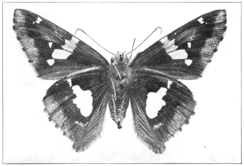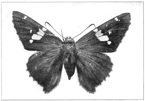 The Silver-spotted Skipper derives its name from the distinct silvery spots upon the under-wing surface against a background of dark brown. The butterflies appear in the Northern states early in June and remain upon the wing for several weeks, being found even in August. They fly very rapidly and are difficult to catch in an insect net except when they are visiting flowers.