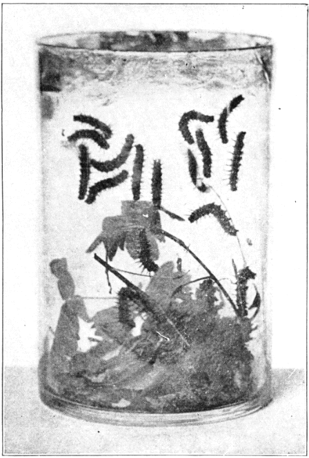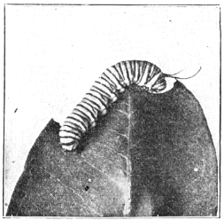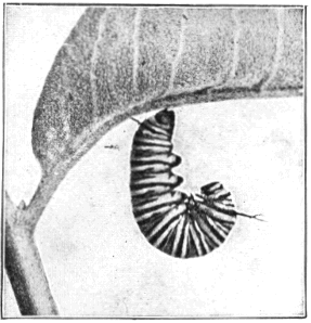 The female butterflies at least have something to do besides sipping the nectar of flowers or idly twirling their [Pg 282] feelers. They must lay their eggs and thus provide for the continuation of the species; to do this they find suitable blades of grass on which they deposit their tiny, half-round, smooth yellow eggs. A week or so later each egg hatches into a dumpy little yellow caterpillar with a black head and a body well covered with hairy bristles. This little creature is a silk spinner and makes a home instinctively by drawing together more or less the outer edges of a leaf blade and fastening them with transverse bands of silk. It then feeds upon the green tissues and as it grows larger it makes its nest more secure by thicker walls of silken web.