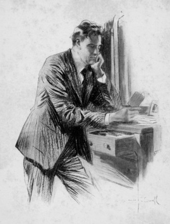 He came to the office door. Without his glasses, and with the girl standing between him and the light, Mr. Stagg squinted a little to see her, stooping, with his hands on his knees.