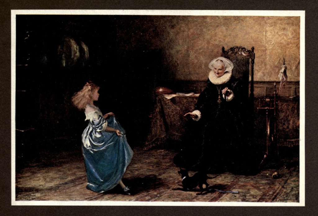 In 1874 Pettie was elected a Royal Academician, filling the vacancy caused by the death of Sir Edwin Landseer. His first exhibits were two of his finest works, "A State Secret," and "Ho! Ho! Old Noll!" The scene in the latter is a tennis-court where two cavaliers are looking on with a chuckle of amusement at the spirited caricature which a third has made upon the wall. "Ho! Ho! Old Noll" is the work of a master draughtsman. The light pose and easy grace of the cavalier who makes the sketch, the foreshortening of his arm, the hand that holds the chalk—so lightly that it seems to move—are all superbly rendered. Two years later, in 1876, he exhibited "The Step," a picture of a little girl with golden hair, in a pale blue dress, dancing before her grandmother. The same old lady, with spinning-wheel and high-backed chair, formed the subject of a picture titled "Grandmother's Memories."