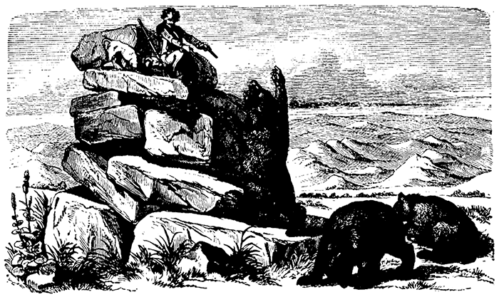 In this way I followed one warm autumn day a remarkably broad bear trail on the mountains of the Rio Grande. Trusty halting fifty yards ahead of me, showed me that it stopped at a small torrent, where the bear had watered on the previous night. I dismounted, examined the trail carefully, and saw that it was made by a very old fat bear; it was in the fatting season, when the bear frequently interrupts its sleep and pays a nocturnal visit to the water. At this season these animals are very clumsy and slow, and cannot run far, as they soon grow scant of breath; they soon stop, and can be easily killed by the hunter—always supposing that he can trust to his dog and horse, for any mistake might expose the rider to great danger. I ordered Trusty to follow the trail; it ran for some distance up the ravine, then went up the bare hill-side, which was covered with loose boulders and large masses of rock, into the valley on the opposite side, in the middle of which was a broad but very swampy pool, girdled by thick thorny bushes. Trusty halted in front of this thicket, looked round to me, and then again at the bushes, while wagging his long tail. I knew the meaning of this signal, and that the bear was not far off. I ordered the dog on, and drew a revolver from my belt; feeling assured that the bear would soon leave the underwood and seek safety in flight. Trusty disappeared in the bushes, and his powerful bark soon resounded through the narrow valley. It was an impossibility for me to ride through the thicket, hence I galloped to the end of the coppice, and saw there the bear going at a rapid pace up the opposite steep hill, with Trusty close at its heels. I tried to cross the swamp, but Czar retreated with a snort, as if to show me the danger of the enterprise. By this time Trusty had caught up to the bear at the top of the hill, and furiously attacked it in the rear. The bear darted round with extraordinary agility, and was within an ace of seizing Trusty, but after making a few springs at the dog, it continued its hurried flight, and disappeared with Trusty over the hill-top. I had ridden farther up the water when I heard my dog baying; I drove the spurs into my horse, and with one immense leap, we were both in the middle of the swamp up to the girths; then, with an indescribable effort, Czar gave three tremendous leaps, which sent black mud flying round us, and reached the opposite firm ground with his fore feet, while his hind quarters sunk in the quivering morass; with one spring I was over his head, when I sank in up to the knees, and after several tremendous exertions, the noble fellow sprang ashore, trembling all over. Trusty's barking, as if for help, continually reached me as I galloped up the steep hill-side; I arrived on the summit at the moment when the bear sprang at Trusty, and buried him beneath its enormous weight. My alarm for the faithful dog—my best friend in these solitudes, made me urge Czar on; he bounded like a cat over the remaining rocks, and I saw Trusty slip out from under the bear in some miraculous way, and attack it again on the flank. I halted about ten paces from the scene of action, held my rifle between the little red fiery eyes of the bright black monster, and laid it lifeless on the bare rocks. The greatest peril for dogs is at the moment when the bear is shot, for they are apt to attack it as it falls, and get crushed in its last convulsive throes. I leapt off Czar, who was greatly excited by the sharp ride, went up to Trusty, who was venting his fury on Bruin's throat, examined him, and found that he had received three very serious wounds, two on the back and one over the left shoulderblade, which were bleeding profusely, though in his fury he did not seem to notice them. I took my case from the holster and sewed up his wounds, during which operation he lay very patiently before me, and looked at me with his large eyes, as if asking whether this were necessary. Then I took off my jacket and set to work on the bear, stripped it, and put the hide as well as a hundred pounds' weight of the flesh on Czar's back. If my readers will bear in mind that the sun was shining on my back furiously, and that I was on a bare blazing rock, they will understand that I was worn out, and longed for a cool resting-place. The bear weighed at least 800 lbs., and it requires a great effort to turn such an animal over.