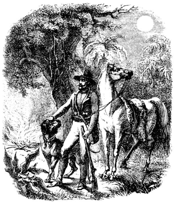 The terrible news aroused all my people. I at once sent a negro to Lasar's to tell him of what had happened, and at the same time beg him to join me as speedily as possible, in order to pursue the Indians, and, if possible, save the prisoners, during which time we made our preparations for immediate departure. I had provisions got ready and packed on a mule, which this time was not faithful Jack, as he had been galled by a badly fastened saddle; after this a stock of ammunition was laid in, and we sat down to supper, which meal we had hardly finished when our friends from Mustang Creek, eight in number, galloped over the prairie, led by old Lasar himself, who was fire and flame, and vowed revenge like the youngest of us. Tiger, Antonio, Königstein, and one of the colonists of the name of Lambert, accompanied me, and we were soon urging our horses at full speed through the gloomy forest.