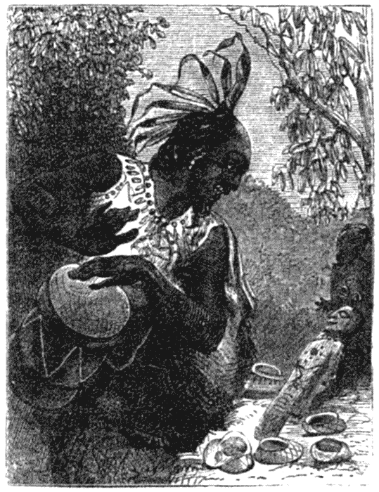 We had finished dinner, and I told the chief that I now wished to give his men their dinner, on which he rose and said that he had better be present or else no order would be kept. We went out in front of the palisade after I had locked my house door, unseen by the two girls, and had the caldron of coffee, sweetened with honey and mixed with milk, brought out, as well as the bread, which last the chief distributed among the various families, telling them to use in coffee-drinking their own utensils, which consisted of shells, horns, and cocoa-nuts. There were above two hundred souls in camp, though among them all were only forty warriors.