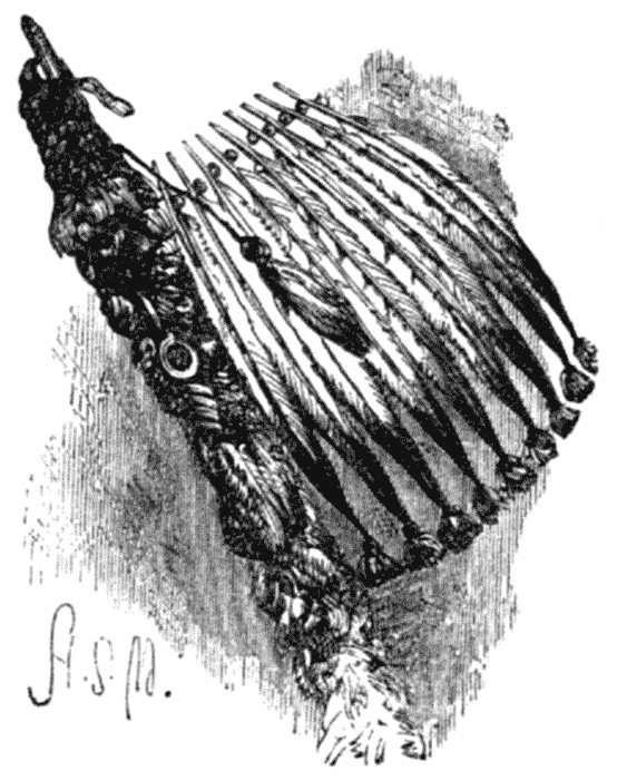 The name of the elder sister, who was about nineteen years of age, was Cachakia (sparkling star), while the younger was called Pahnawhay (fire), and had not seen more than sixteen summers. The costume of these two savage beauties was much alike. Over their shoulders hung a handsomely painted, costly dressed deer-hide, in the centre of which was a long slit, through which they thrust head and neck. This mantilla was ornamented all round with a fine long leathern fringe, to whose ends glistening stones and shells were attached; it hung lower down before and behind, and left the pretty round arms at liberty. Round their hips was a petticoat, also of leather, adorned with long fringe, and handsomely painted in colours, while the leathern trousers were also decorated at the sides with similar fringe. Their little feet were thrust into deer-hide shoes, also ornamented with, stones, shells, and fringe.
