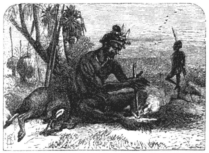 I now showed the chief the fat ox, which I had shut up in the cow's milking enclosure, remarking at the same time that I intended to give it to his people, and asked whether it should be shot now, to which he assented. Königstein brought me a rifle and I shot the ox through the skull, after which some of the Indians skinned and carried the joints to camp. Ere long some thirty fires were lighted, round which the Indians lay and roasted the meat, while constantly running to the coffee-caldron to fill their vessels.