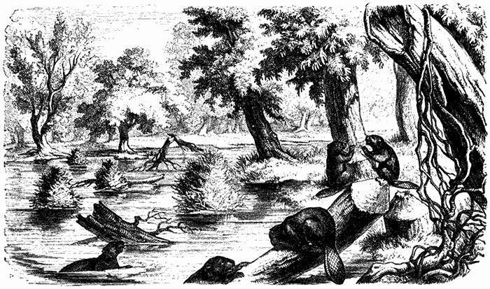 I accidentally looked again toward the sparkling water and noticed a trunk of a tree in the middle of it, which I had not seen a few moments previously. What could have raised it from the bottom of the pond to the surface? I sat up a little and saw a second and a third emerge by its side: I did not stir, but continued to gaze, and in ten minutes the pools were covered with old wood. I cried in a low voice to Tiger to look, but he had scarce done so ere he laughed, and said they were alligators enjoying the sunshine. The surface of both pools was literally covered with these monsters, mostly of a large size. I cried to my comrades to take their rifles, quietly aim at their heads, and fire when I gave the signal. I did so; our guns exploded simultaneously, and the water spirted up furiously, and bedewed the grass for a long way round. Only two of the monsters remained in sight, shooting backwards and forwards in the water, and beating their tails so furiously that the spray dashed over us. At this moment Antonio came up with a lasso, and in an instant threw the noose over one of the furious creatures. We all ran with the end of the rope over the grass, and dragged the alligator on land, when it snapped savagely around with its fearful jaws, and lashed its tail. We now set to work with pistols, and ere long its head had so many holes in it that it could not move its dangerous jaws. Its comrade was still swimming quietly on the top of the water, so we fetched it out too on to the grass, when it behaved as furiously as the first, but we soon put an end to its fun. They were two gigantic animals, nearly sixteen feet long, and their throats were armed with rows of terrible teeth, some of which we all took as a memento.