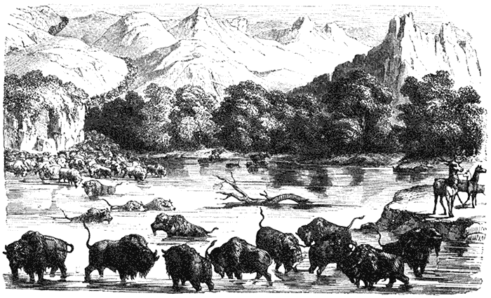 Lost in admiration of these natural beauties, which words are powerless to describe, I reached the hilly ground near the mountain springs; and first learned from Czar's tugging at the bridle, and his repeated bounds, that I had come in sight of a herd of about forty buffaloes, that did not appear to notice me yet. Probably they were engaged with that portion of the beauties of nature which most interested them; for, at any rate, they all had their huge shaggy heads buried in the fresh young grass. I was never better inclined to have a jolly chase than on this day, and the same was the case with Czar and Trusty. I let loose the reins, drew a revolver, and dashed among the astounded herd, looking for a plump bull. Surprised and disturbed, these philosophers turned their heads towards the mountains, raised their tails erect, and started in their awkward gallop, with the exception of one old fellow, the very one I had selected for the attack. He looked after the fugitives for awhile, as if reproaching them with their cowardice; shook his wild shaggy mane several times, and then dashed furiously at me with his head down. I was so surprised at this unexpected attack that I did not fire, but turned my horse to fly. The buffalo pursued me some thousand yards, keeping rather close, while his companions halted, and seemed to be admiring the chivalric deed of their knight. At length he stopped, as he had convinced himself that he could not catch up to me, and stamped with his long-haired front legs till the dust flew up in a cloud around him. I turned my horse and raised my rifle, to make more sure of hitting the bull, as his determined conduct had imbued me with some degree of respect. I fired, and wounded him in the side a little too far back; at the same instant he dashed ahead again, but then thought better of it, and tried to rejoin the flying herd. I now set Trusty on him, who soon brought him at bay, and I gave him a bullet from the revolver. Again he rushed at me, and again fled. In this way, pursuing and pursued in turn, I had given him five bullets, when he left the herd in a perfect state of mania, and dashed after me. I made a short turn with my horse; the bull rushed past; I turned Czar again towards the buffalo; and as I passed I put a bullet through his heart at the distance of three yards. The monster fell to the ground in a cloud of dust, and raised up a heap of loose sand which it stained with its dark blood.