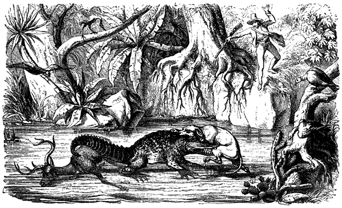About ten o'clock I rode through a prairie which ran down to the Mustang, which here an insignificant stream, flowed between high banks over loose pebbles, and was only deep at isolated spots. The prairie was covered with clumps of tall cactus and sunflowers, and I was riding between some of them when a large stag got up before me and stopped a little way ahead. I turned Czar half round and shot the stag, which fell, but got up again and ran off to the Mustang. As I saw that it was very sick, I sent Trusty after it, who soon disappeared with it in a thicket, and I had scarcely reloaded when I heard his hoarse bark and recognised by its tone that he was occupied with something else than the stag. I went up the wood as fast as Czar could carry me, leapt off and ran through the bushes to the bank where I heard Trusty's voice. A mortal terror assailed me on seeing Trusty in shallow water near a deep spot, with his left hind leg in the jaw of an alligator, whose skull he was smashing with his teeth, though this did not make it open its clenched teeth. I sprang at one bound into the river, in order to prevent the horrible brute from reaching deep water, to which it was retreating and was only a few feet from it. I sprang on the beast's back, held it between my knees tightly, and lifted it into the shallow water while it lashed its tail madly. I now pulled out a revolver, held it against the hinge of the jawbone, and fired one bullet after the other till the bones were splintered and the lower jaw fell off, liberating Trusty from his arrest. I examined him and found that his leg bone was not injured, though the flesh had suffered severely: at the same time he was losing much blood and appeared to be enduring great pain. The stag lay close to the scene of contest, so I drew it ashore and cut off the haunches; then I fetched Czar, bound one of them on either side of the saddle, packed a lot of bushes on the lot and spread my blanket over them, on which I raised Trusty, after I had bound up his wounds as well as I could with wet pocket handkerchiefs. I reached home in the afternoon, and at once made a decoction of the roots of the tulip and pomegranate and willow bark, in order to check the fever, which it soon effected, combined with a strict regimen.