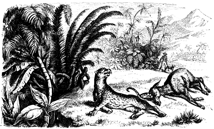 It was one of those mild southern spring nights when man feels beneath the star-enamelled vault of heaven that he is nowhere better in health or stronger than in the open air. The odour of the flowers had sunk upon the earth with the motionless air, and the glistening insect world sparkled and flashed like streams of diamonds from the dark shade of the evergreen shiny foliage. Lying round our small camp-fire, we were soon lulled to sleep by the feathered songsters of the night, among which the mocking-bird appealing to its mate was the most remarkable, and we negligently allowed the last flames to die out; but at a late hour we were startled by the roar of a jaguar close to us, and on awaking we recognised the sound of flying horses. We ran to our cattle, and only found Czar and John's mare, snorting and dragging at their bonds, while the Indian's horse and Lasar's mule had bolted, and we heard Trusty barking down the glen. We quickly blew up our fire, and threw fresh wood on it; but the damage was done, and we might reckon with certainty on the loss of one if not both beasts. We spent the rest of the night on the watch, and just as day dawned, and we had breakfasted I rode accompanied by Trusty, down the glen, while John and the Indian proceeded to the mountains in search of our fugitives. Only Lasar remained in camp, as walking through the grass was too fatiguing for him. I followed the foot of the hills, along which ran a stream overshadowed by yuccas, tree-like aloes, gigantic cactuses, palms and mimosas, and had ridden about four miles, following the tracking dog, when the latter showed me on the clayey bank on which no grass grew the hoofmarks of our mule and the imprints of a jaguar running down to the stream. Not long after, on riding round a projecting clump of shrubs, I noticed in the grass Lasar's mule, and upon it an enormous jaguar, which appeared to be asleep, as its golden-spotted body lay stretched out and motionless. I led Czar back into the bushes, and then crept down the stream nearer to the beast of prey, until I concealed myself within shot in a tuft of old mimosa trees, from which I could survey it. Laying my rifle on a low branch, I aimed at the centre of the brute's back, which was turned toward me, as its head rested on the mule. I fired, the jaguar sprang up, but fell on its side immediately, and while uttering an awful roar, looked about the valley in search of its assailant. It was unable to rise on its hind-legs, and strove to drag itself on its forepaws to the adjacent water. I had reloaded in the meantime, and stepped out of my hiding-place on to the grass plot. The jaguar now saw me, its fury increased with every step I took, and dragging itself toward me it made the hills ring with its savage roars. I walked pretty nearly up to it, and put an end to its life with a bullet through the head; then I went to Lasar's mule, whose belly was slit up, and one of its legs devoured. The jaguar must have caught it up while running, for on its croup I found numerous wounds where the beast had buried its claws.