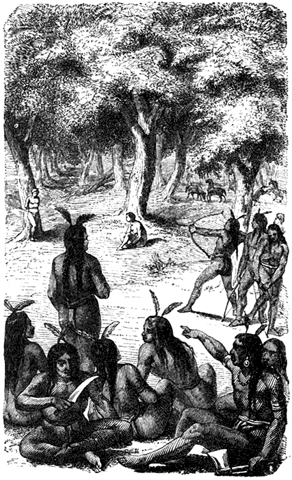 Evening arrived; we supped, and when the moon had fully risen, went out to the Indian camp, as the chief wished to spend the night with his men, because the latter might be alarmed about him if he slept in the Fort with me. We had hardly reached the first fire, when we heard a fearful row at the other end of the camp, and the chief ran with his two colleagues in the direction of it. I was anxious about what was going on there, and hastened after them, accompanied by the two Indian girls. Two young men had quarrelled, and were engaged in a violent dispute when we came up, while the voices of the chief and his colleagues were raised to a loud key. Suddenly, however, the two men rushed to different fires, seized their bows and arrows, flew about a hundred yards apart into the prairie, and in a few minutes disappeared from sight. The chief shouted after them, but no one pursued them. The Mexican was standing not far from us at the next fire, and I called him up to give me an explanation of the disturbance. Pahnawhay, however, explained to me with a few very intelligible signs, that the two young men loved the same girl, and she had given her affection to both, upon which they quarrelled, and had run off to kill one another. The Mexican confirmed this statement, on which I asked why no one tried to prevent it, but I received the laughing reply, as if the thing were self-evident, that this was impossible.