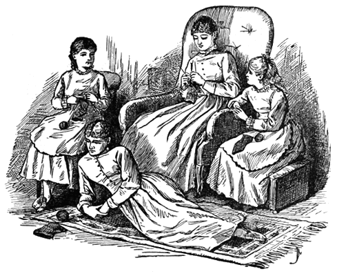 As young readers like to know "how people look," we will take this moment to give them a little sketch of the four sisters, who sat knitting away in the twilight, while the December snow fell quietly without, and the fire crackled cheerfully within. It was a comfortable old room, though the carpet was faded and the furniture very plain; for a good picture or two hung on the walls, books filled the recesses, chrysanthemums and Christmas roses bloomed in the windows, and a pleasant atmosphere of home-peace pervaded it.