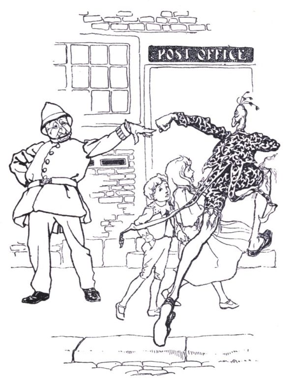 She had barely finished speaking when Mr Swinglebinks and his Time Exchange disappeared, and they were alone with the Zankiwank. But not for long, for almost immediately a troop of school children came bounding home from school, but children with the oddest heads and faces ever seen. They were all carrying miniature bellows in their hands, which they were working up and down with great energy.