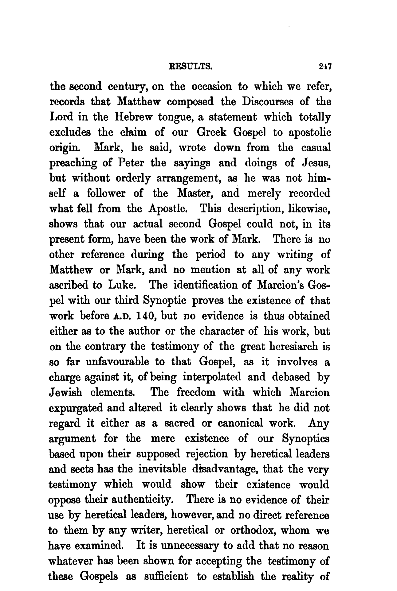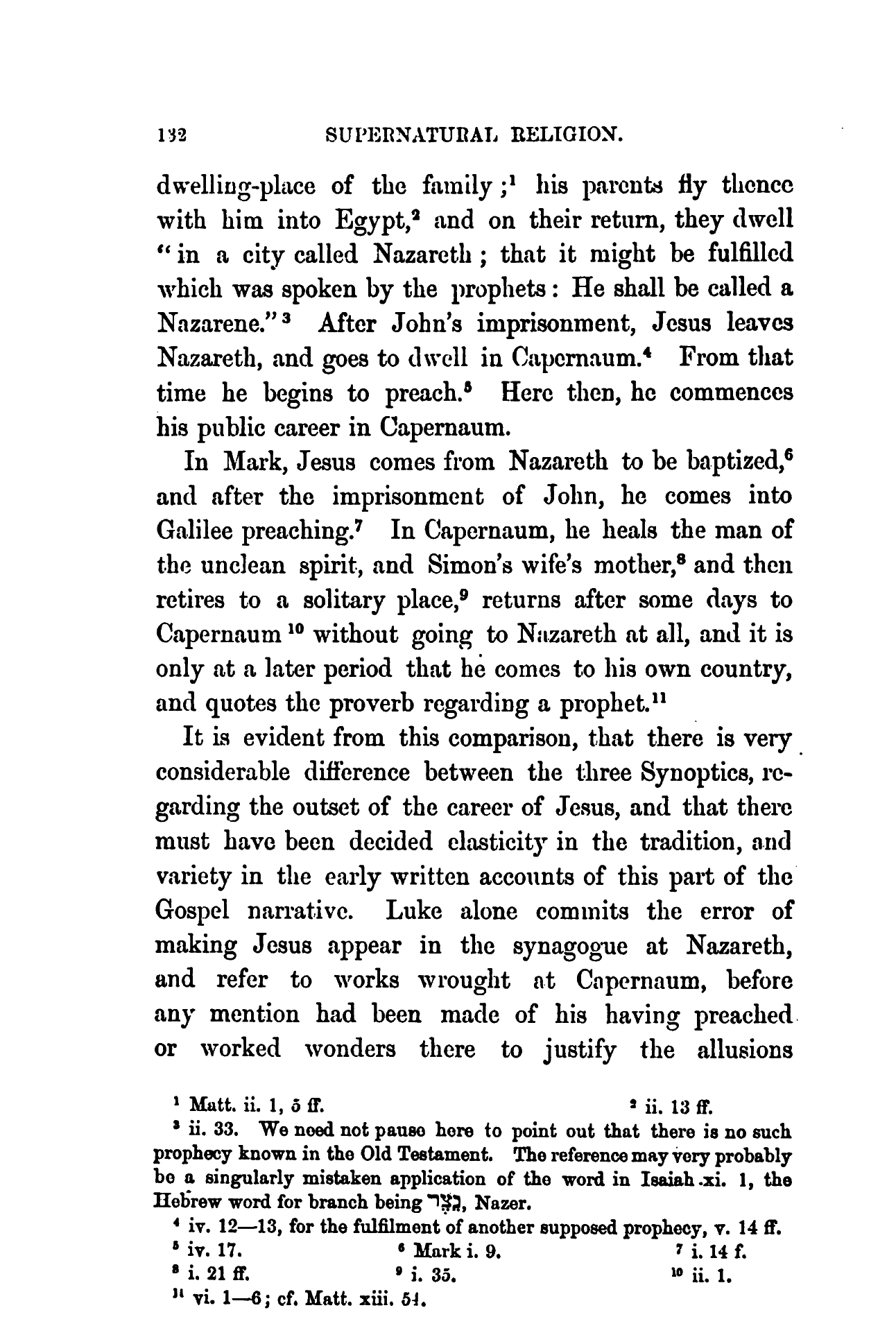 and in his own house" [———]t this passage would undoubtedly be claimed by apologists as a quotation from Mark vi. 4, and as proving the existence and use of that Gospel. The omission of the words "and among his own kin" [———] would at first be explained as mere abbreviation, or defect of memory, but on the discovery that part or all of these words are omitted from some MSS., that for instance the phrase is erased from the oldest manuscript known, the Cod. Sinaiticus, the derivation from the second Gospel would be considered as established. The author notwithstanding might never have seen that Gospel, for the quotation is taken from Matt. xiii. 57.(2)