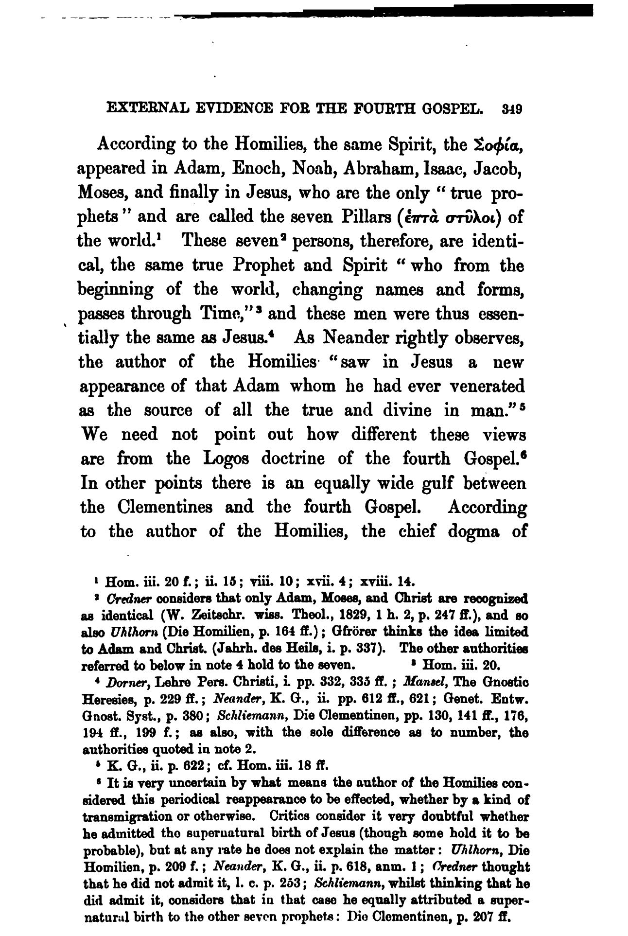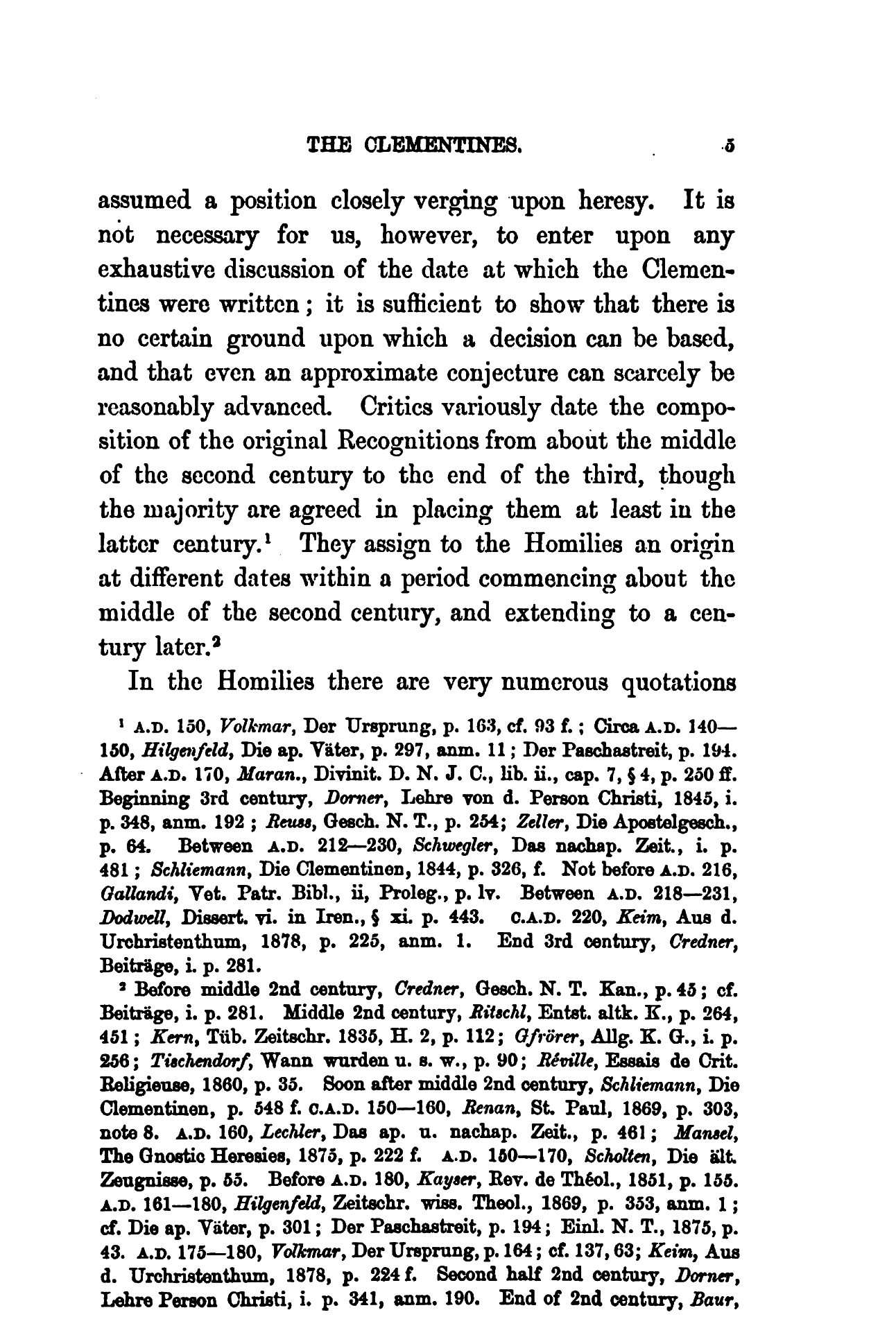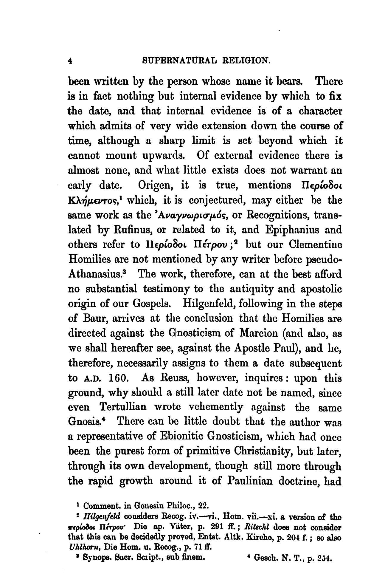 been written by the person whose name it bears. There is in fact nothing but internal evidence by which to fix the date, and that internal evidence is of a character which admits of very wide extension down the course of time, although a sharp limit is set beyond which it cannot mount upwards. Of external evidence there is almost none, and what little exists does not warrant an early date. Origen, it is true, mentions [———],(1) which, it is conjectured, may either be the same work as the [———], or Recognitions, translated by Rufinus, or related to it, and Epiphanius and others refer to [———];(2) but our Clementine Homilies are not mentioned by any writer before pseudo-Athanasius.(3) The work, therefore, can at the best afford no substantial testimony to the antiquity and apostolic origin of our Gospels. Hilgenfeld, following in the steps of Baur, arrives at the conclusion that the Homilies are directed against the Gnosticism of Marcion (and also, as we shall hereafter see, against the Apostle Paul), and he, therefore, necessarily assigns to them a date subsequent to a.d. 160. As Reuss, however, inquires: upon this ground, why should a still later date not be named, since even Tertullian wrote vehemently against the same Gnosis.(4) There can be little doubt that the author was a representative of Ebionitic Gnosticism, which had once been the purest form of primitive Christianity, but later, through its own development, though still more through the rapid growth around it of Paulinian doctrine, had