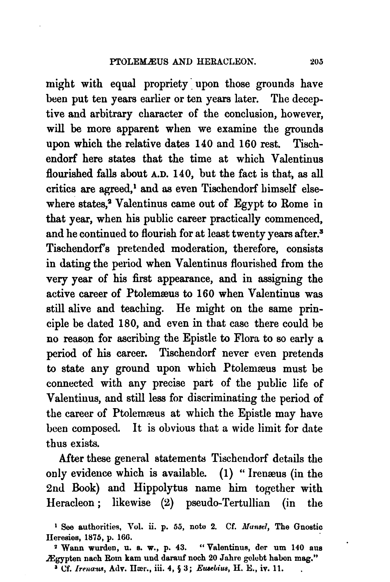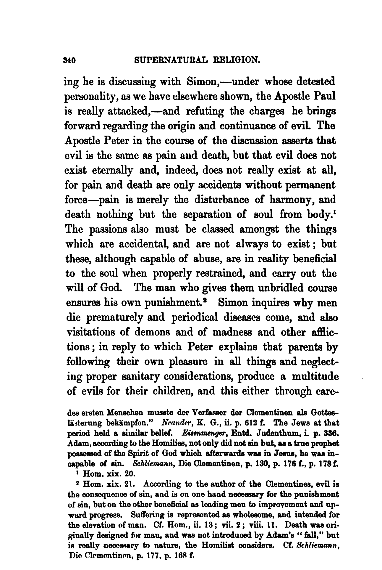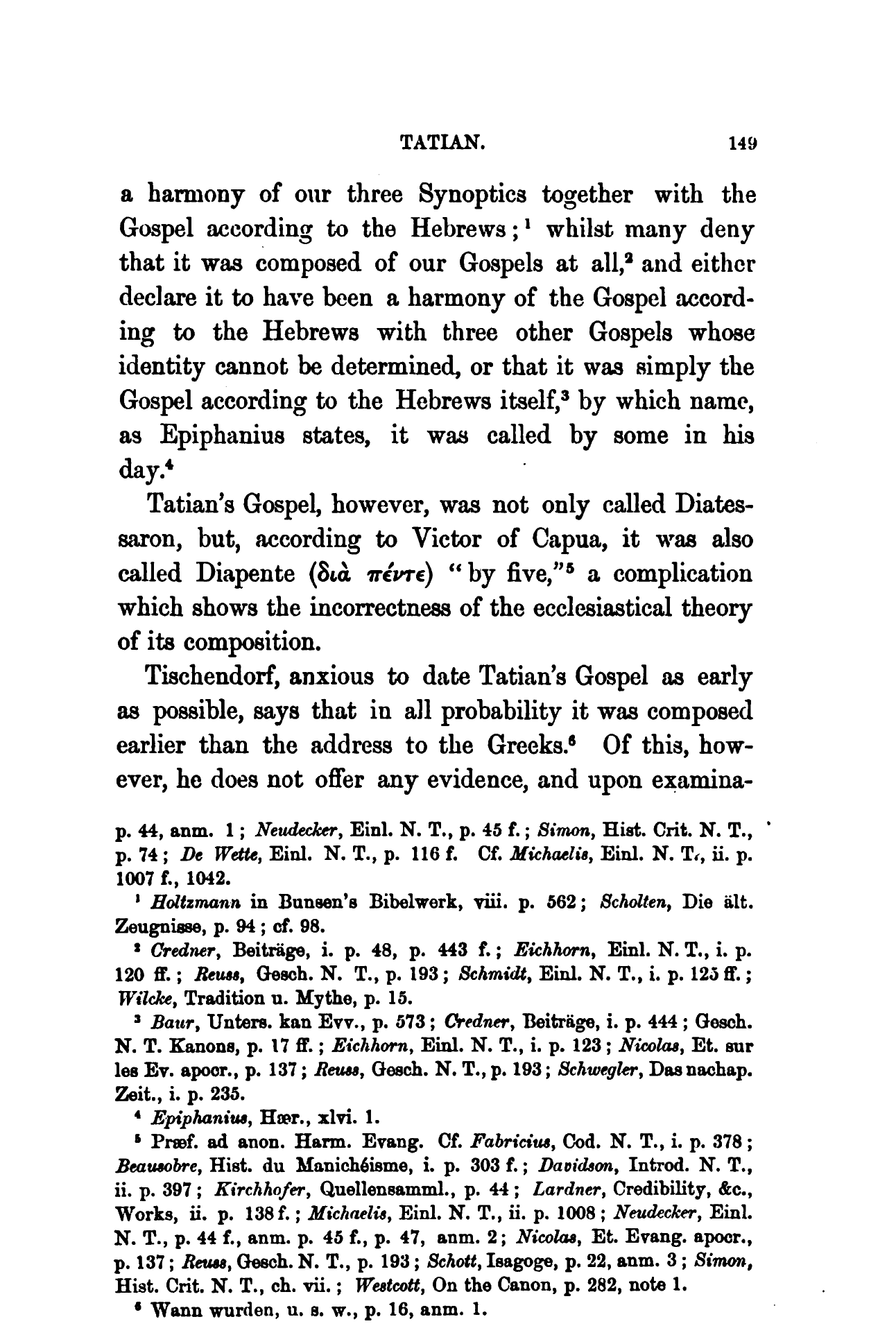 been written by the person whose name it bears. There is in fact nothing but internal evidence by which to fix the date, and that internal evidence is of a character which admits of very wide extension down the course of time, although a sharp limit is set beyond which it cannot mount upwards. Of external evidence there is almost none, and what little exists does not warrant an early date. Origen, it is true, mentions [———],(1) which, it is conjectured, may either be the same work as the [———], or Recognitions, translated by Rufinus, or related to it, and Epiphanius and others refer to [———];(2) but our Clementine Homilies are not mentioned by any writer before pseudo-Athanasius.(3) The work, therefore, can at the best afford no substantial testimony to the antiquity and apostolic origin of our Gospels. Hilgenfeld, following in the steps of Baur, arrives at the conclusion that the Homilies are directed against the Gnosticism of Marcion (and also, as we shall hereafter see, against the Apostle Paul), and he, therefore, necessarily assigns to them a date subsequent to a.d. 160. As Reuss, however, inquires: upon this ground, why should a still later date not be named, since even Tertullian wrote vehemently against the same Gnosis.(4) There can be little doubt that the author was a representative of Ebionitic Gnosticism, which had once been the purest form of primitive Christianity, but later, through its own development, though still more through the rapid growth around it of Paulinian doctrine, had
