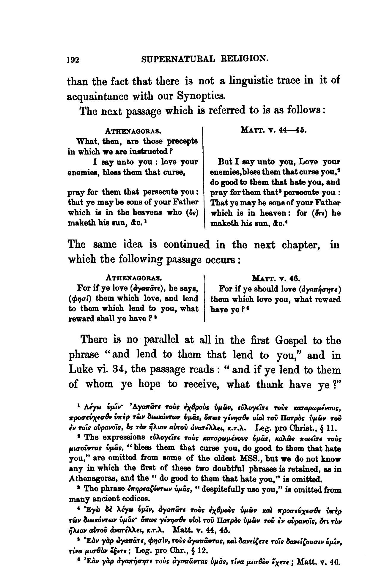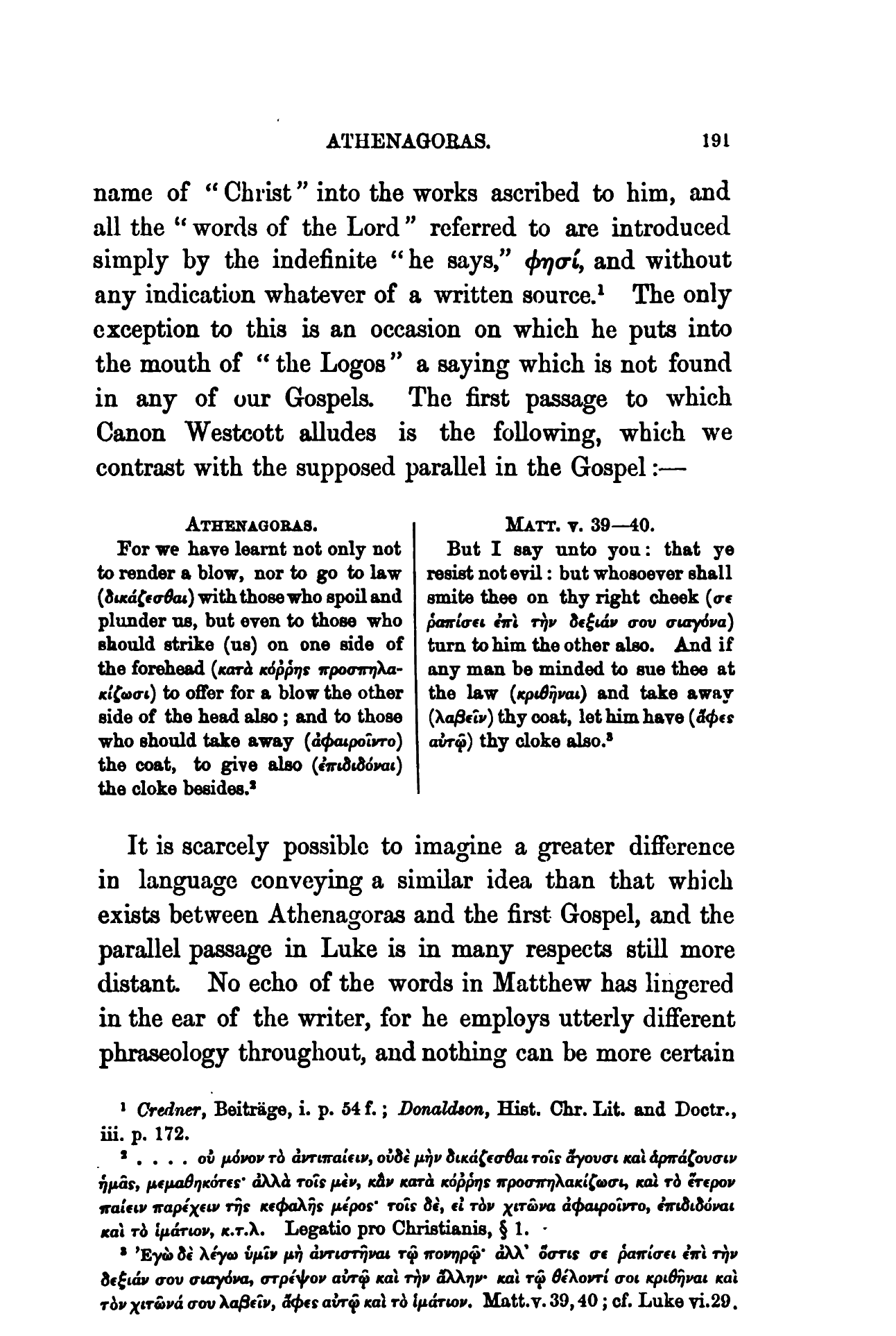 As we have already discussed this passage(1) we need not repeat our remarks here. That this passage comes from a source different from our Gospels is rendered still more probable by the quotation in Hom. xix. 2 being preceded by another which has no parallel at all in our Gospels. "And elsewhere he said, 'He who sowed the bad seed is the devil' [———](2): and again: 'Give no pretext to the evil one.'(2) [———]. But in exhorting he prescribes: 'Let your yea be yea.'" &c. The first of these phrases differs markedly from our Gospels; the second is not in them at all; the third, which we are considering, differs likewise in an important degree in common with Justin's quotation, and there is every reason for supposing that the whole were derived from the same unknown source.(3) In the same Homily, xix. 2, there occurs also the passage which exhibits variations likewise found in Justin, which we have already examined,(4) and now
