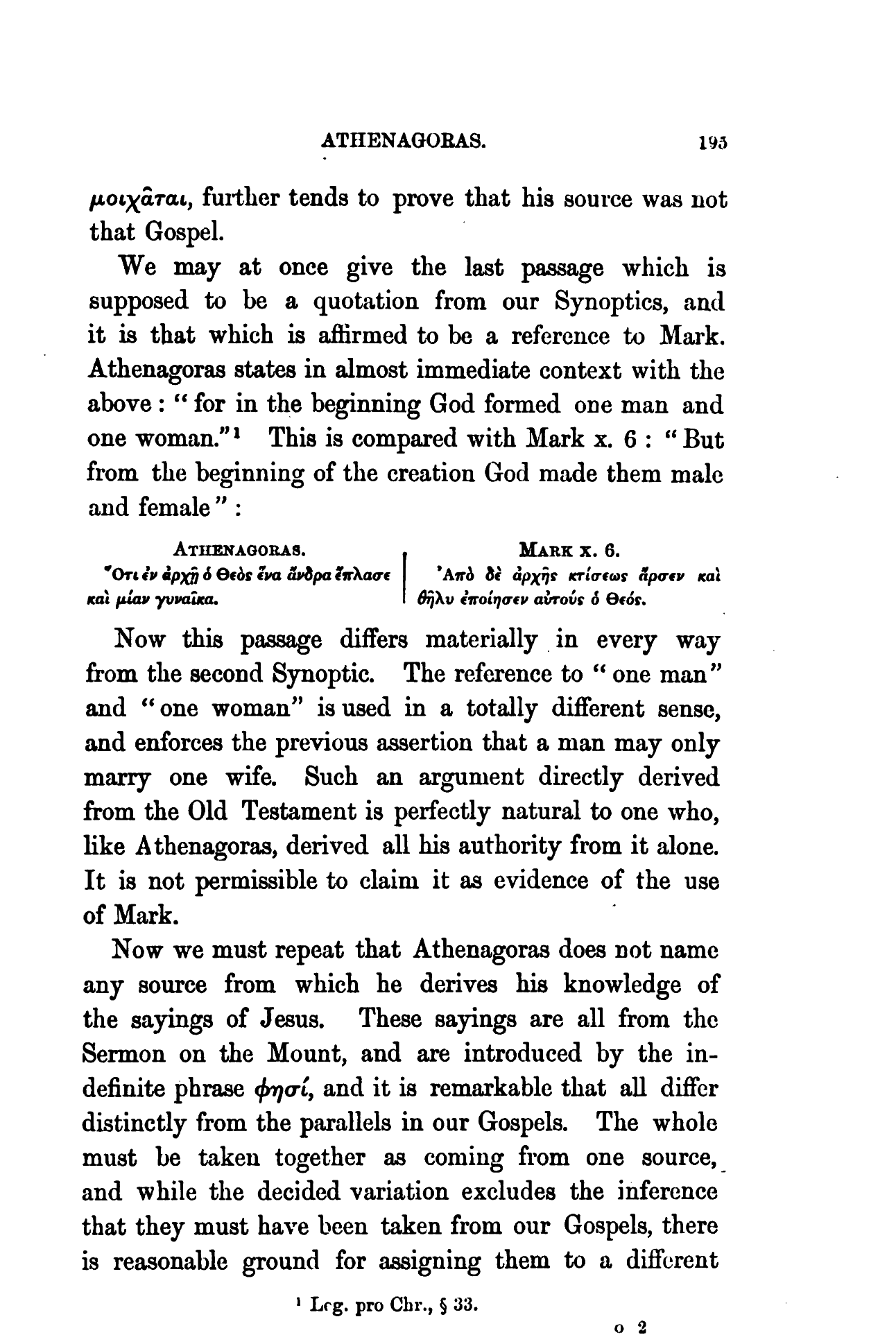 the Recognitions, whether that work be of older or more recent date, the passage does not occur at all. Now, although it is impossible to say how and where this erroneous reference to a passage of the Old Testament first occurred, there is no reason for affirming that it originated in our first Synoptic, and as little for asserting that its occurrence in the Clementine Homilies, with so different a context and object, involves the conclusion that their author derived it from the Gospel, and not from the Old Testament or some other source. On the contrary, the peculiar argument based upon it in the Homilies suggests a different origin, and it is very probable that the passage, with its erroneous reference, was derived by both from another and common source.