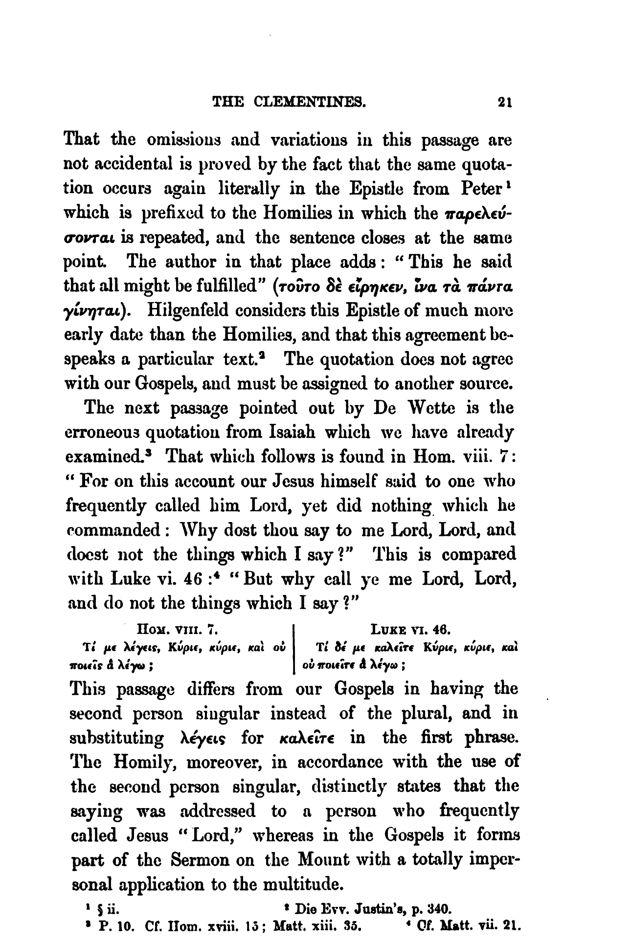We have already quoted the opinion of De Wette as to the inconclusive nature of the deductions to be drawn from the quotations in the pseudo-Clementine writings regarding their source, but in pursuance of the plan we have adopted we shall now examine the passages which he cites as most nearly agreeing with our Gospels.(3) The first of these occurs in Hom. iii. 18: "The Scribes and the Pharisees sit upon Moses' seat; all things therefore, whatsoever they speak to you, hear them," which is compared with Matt, xxiii. 2, 3: "The Scribes and the Pharisees sit upon Moses' seat; all things therefore, whatsoever they say to you, do and observe." We subjoin the Greek of the latter half of these passages.